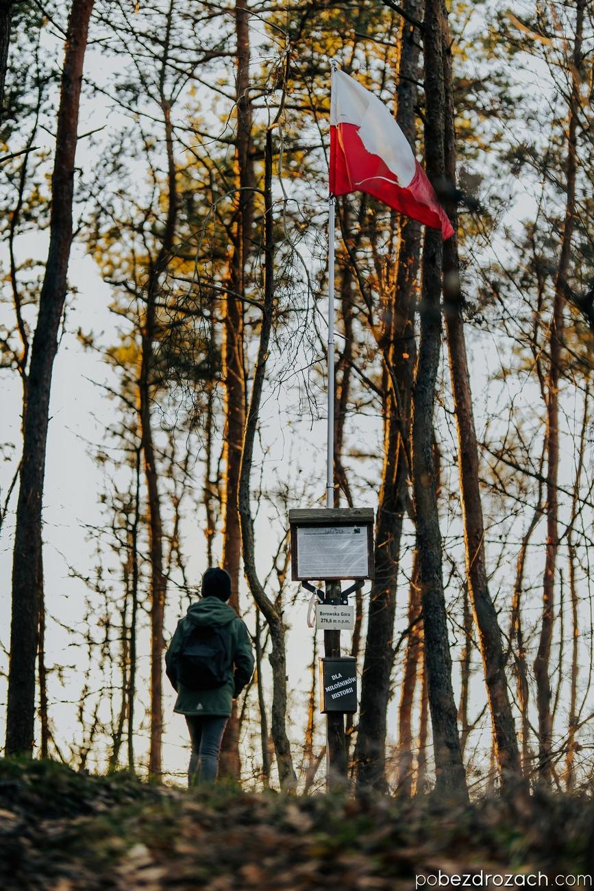 Przygodę z naszym rodzinnym projektem rozpoczynamy na Wysoczyźnie Bełchatowskiej od zdobycia dobrze znanego nam szczytu – Borowskiej Góry (276 m n.p.m.). Dość krótka lecz przyjemna trasa prowadzi nas leśnymi ścieżkami wprost do tabliczki szczytowej oraz masztu z polską flagą. To właśnie tutaj przybijamy nasze pierwsze pamiątkowe pieczątki oraz delektujemy się pięknym zachodem słońca. Po małej przerwie kierujemy się w dół tworząc pętle wokół wzniesienia, a następnie udajemy na cmentarz wojenny oraz pod pomnik upamiętniający poległych w trakcie walk (nazywanych „Piotrkowskimi Termopilami”) obrońców Gór Borowskich. Aż trudno sobie wyobrazić, że te piękne tereny są tak mocno naznaczone historią i krwią tylu ludzi…
